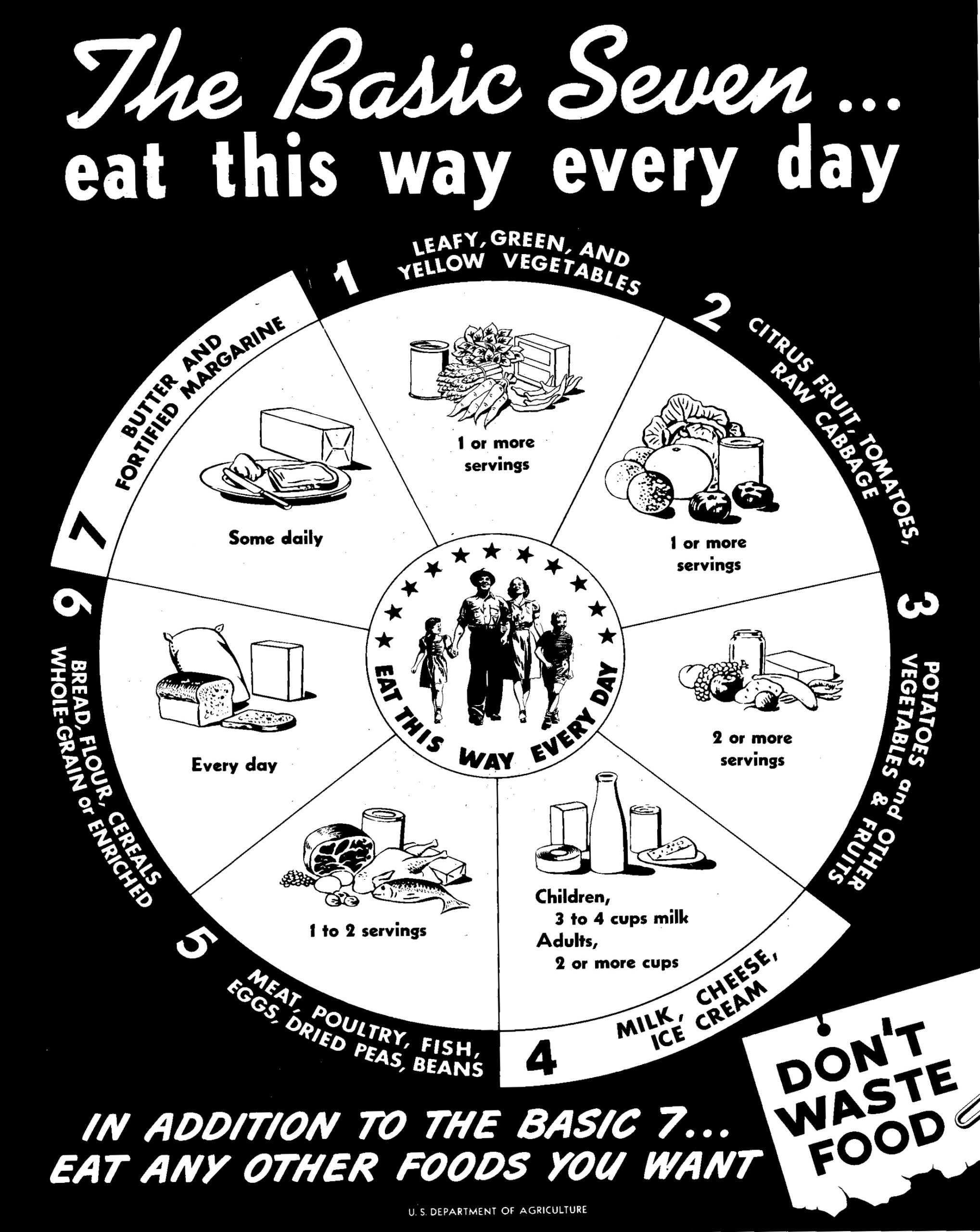 One of the first government graphics on recommended food groups was published by the Swedish government in 1972. It featured a seven slice pizza-shape, with three separate groups for vegetables (leafy/green/yellow, citrus fruit/tomatoes/raw cabbage, and potatoes/other fruit), a milk/cheese/ice cream group, and a group just for butter/fortified margarine!